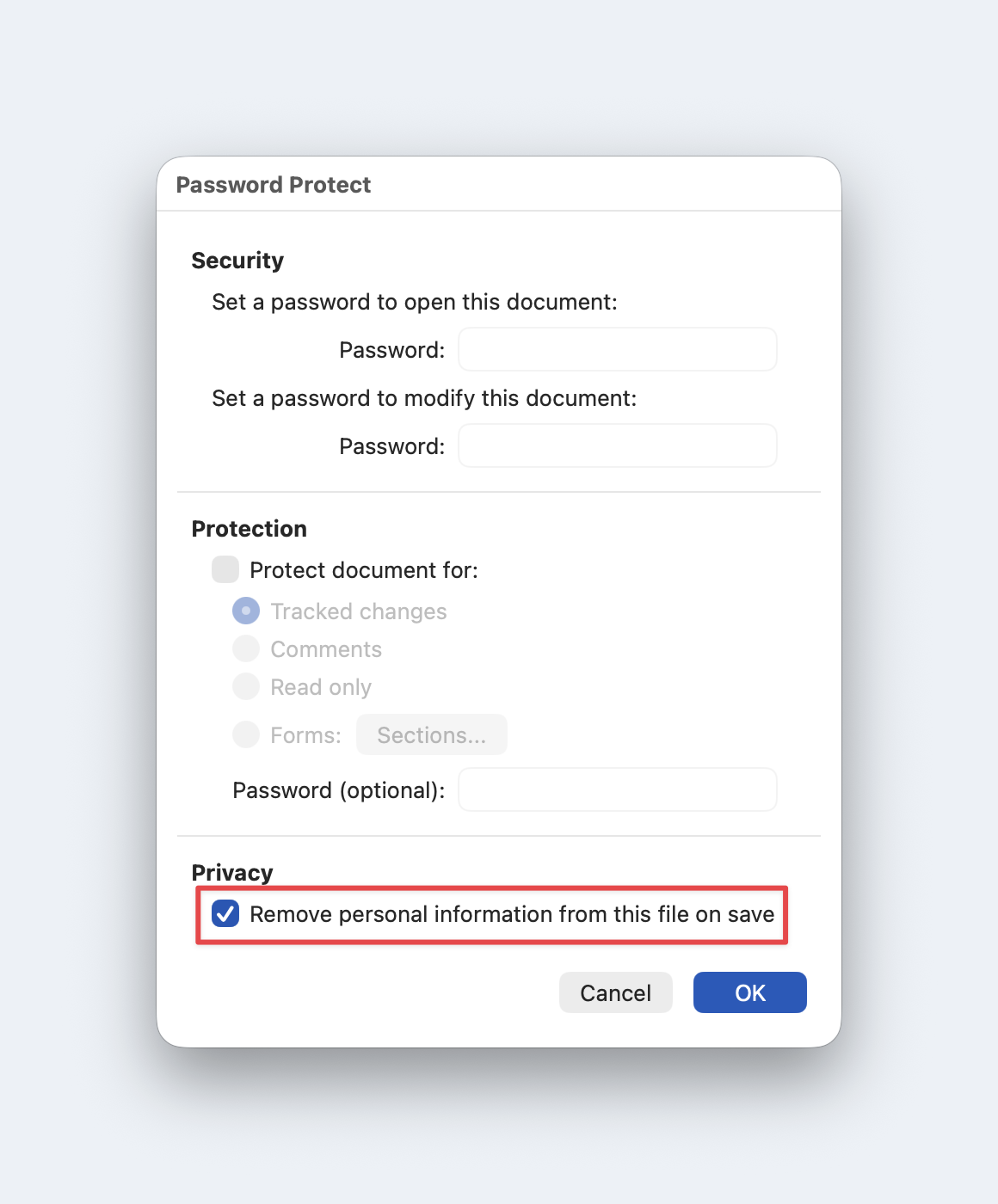- Before sending externally, run Document Inspector (File → Info → Check for Issues → Inspect Document), then Remove All as needed. On Mac, use Protect Document to remove personal info.